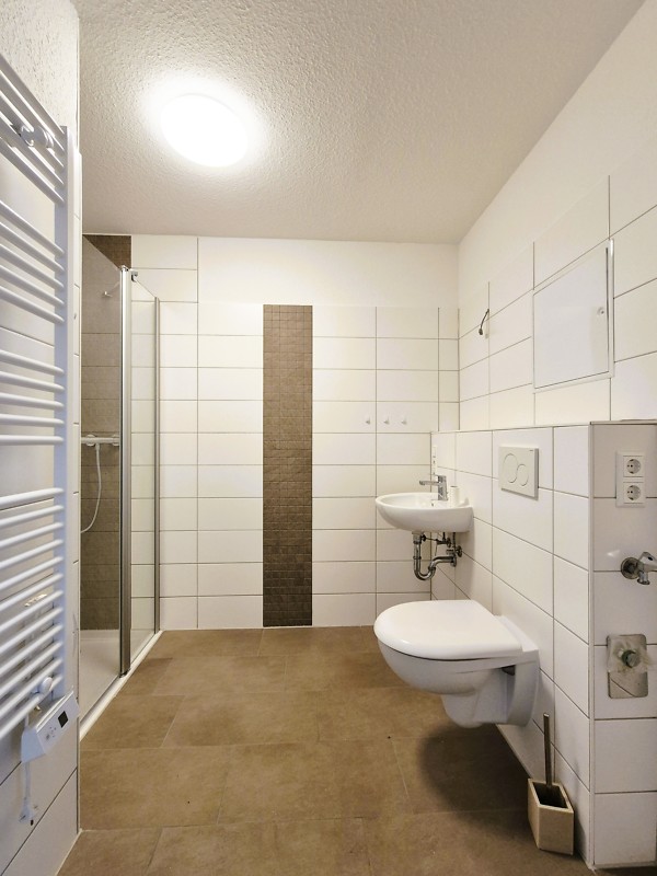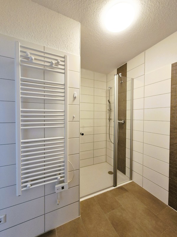 - modernes Bad mit großzügiger ebenerdiger Dusche, Waschmaschinenanschluss und Handtuchwandheizkörper